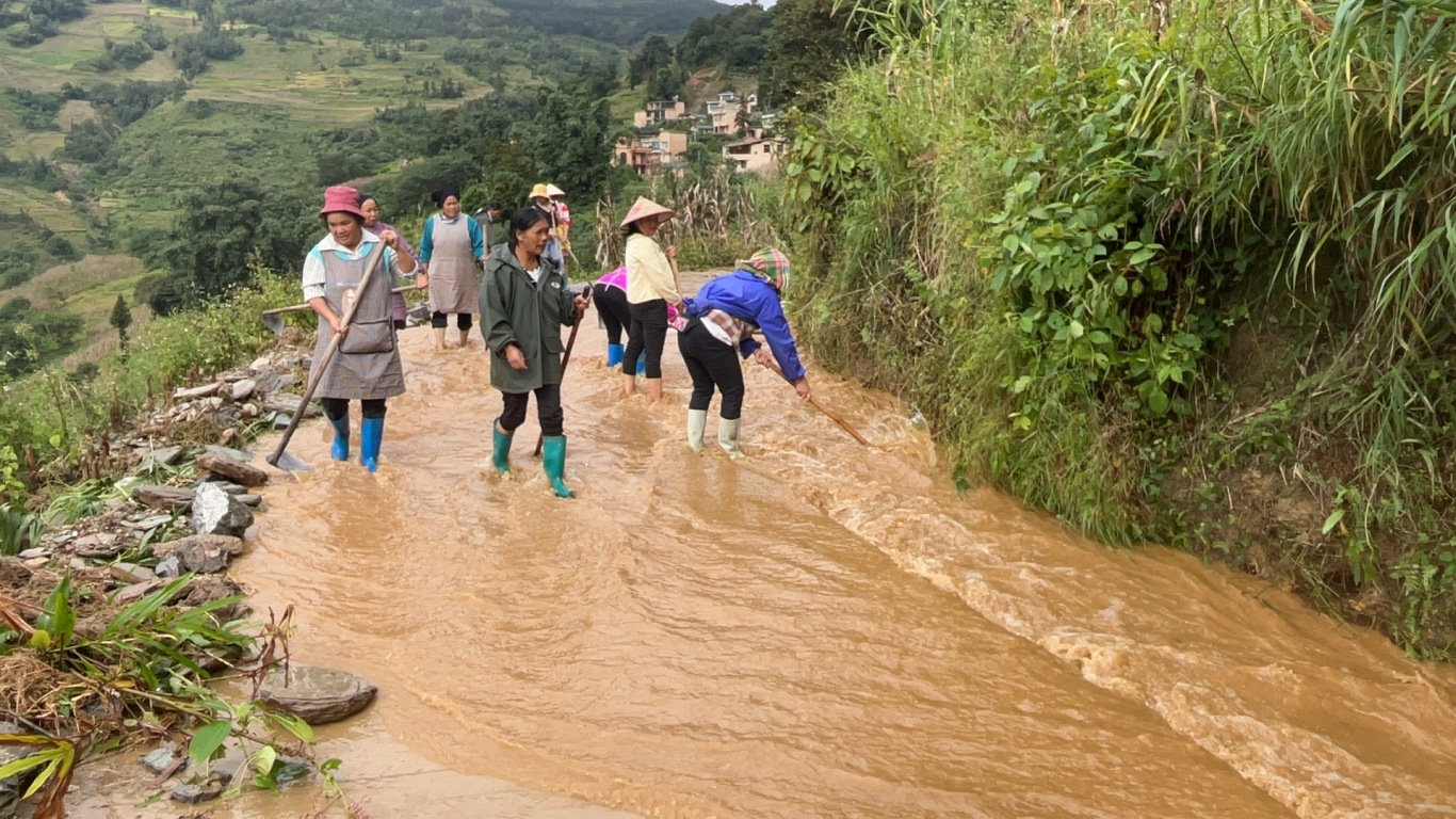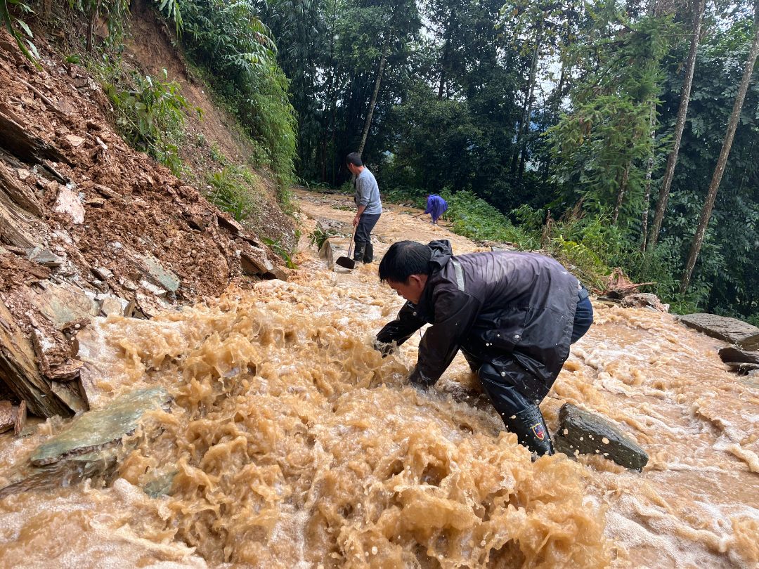 受多轮台风影响,金厂镇接连遭长时间强降雨,部分道路垮塌、滑坡,石流随着雨水冲向低处。金厂镇下田房村地势为山脊偏坡,地处偏远,山高沟夹,面对强降雨,雨水顺势而下,部分排水沟水位迅速上涨,部分路段出现泥土淤积,山体滑坡的风险陡增。