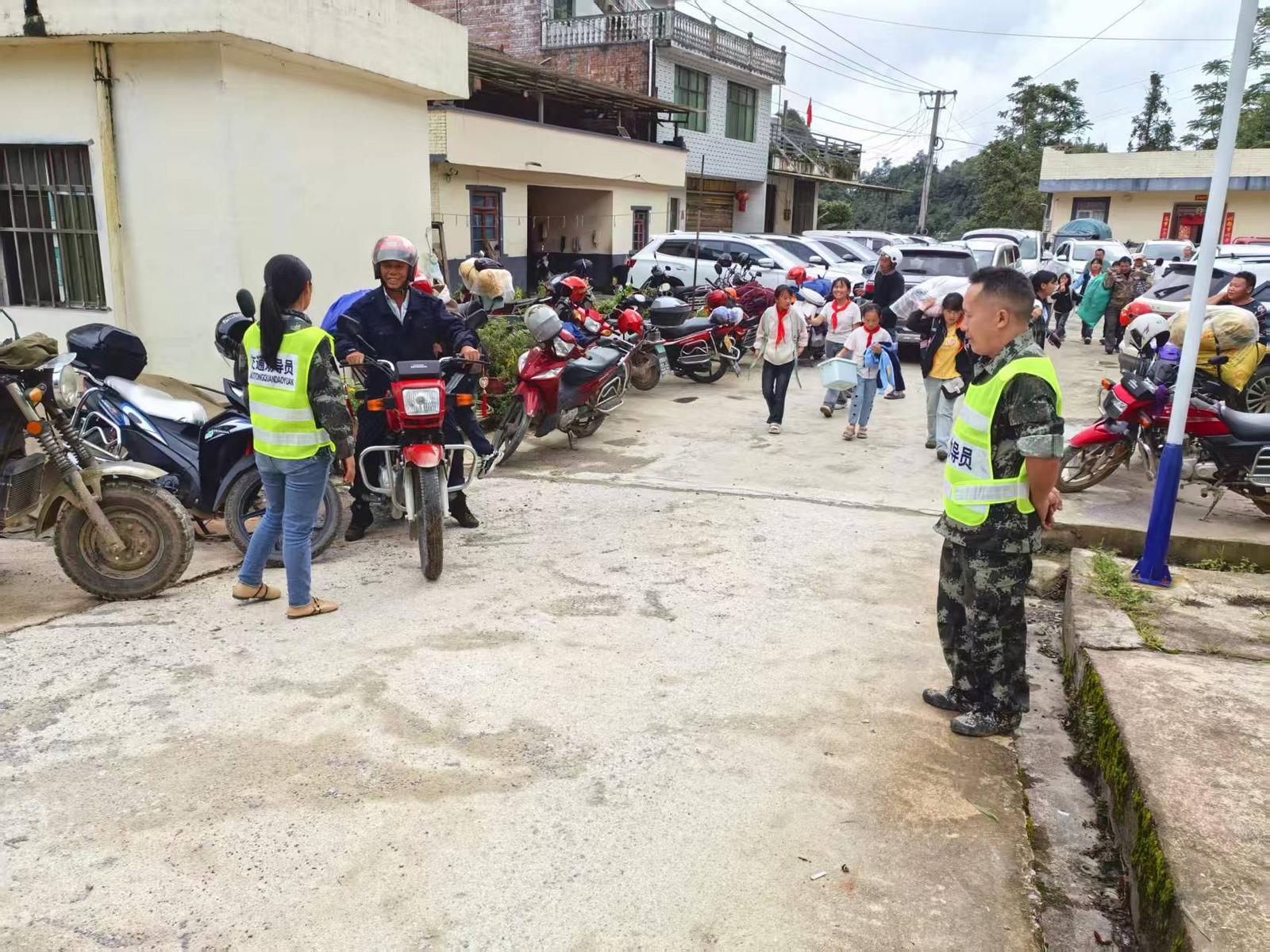 双线并行强守护。上下学高峰时段,“荧光绿”警服与村委会“红袖章”成为校园门口最安心的风景线。特别是中学周五放假和周日开学时段,街道交通较为混乱,“护学岗”成员提前30分钟到岗,在校园周边重点路段设置临时疏导点,引导接送车辆即停即走、规范停放。针对周一赶集日车流密集的情况,采取“定点值守+动态巡逻”相结合的方式,清理占道经营、乱堆乱放现象,打通校园周边“微循环”,确保学生通行安全有序。对于居住在偏远村寨、步行路程超过1小时的学生,村委会村小组党员干部提前摸排梳理留守儿童、单亲家庭学生等重点帮扶对象,建立动态管理台账,规划4条固定护送路线,采用“摩托巡线+步巡补盲”模式接送学生。