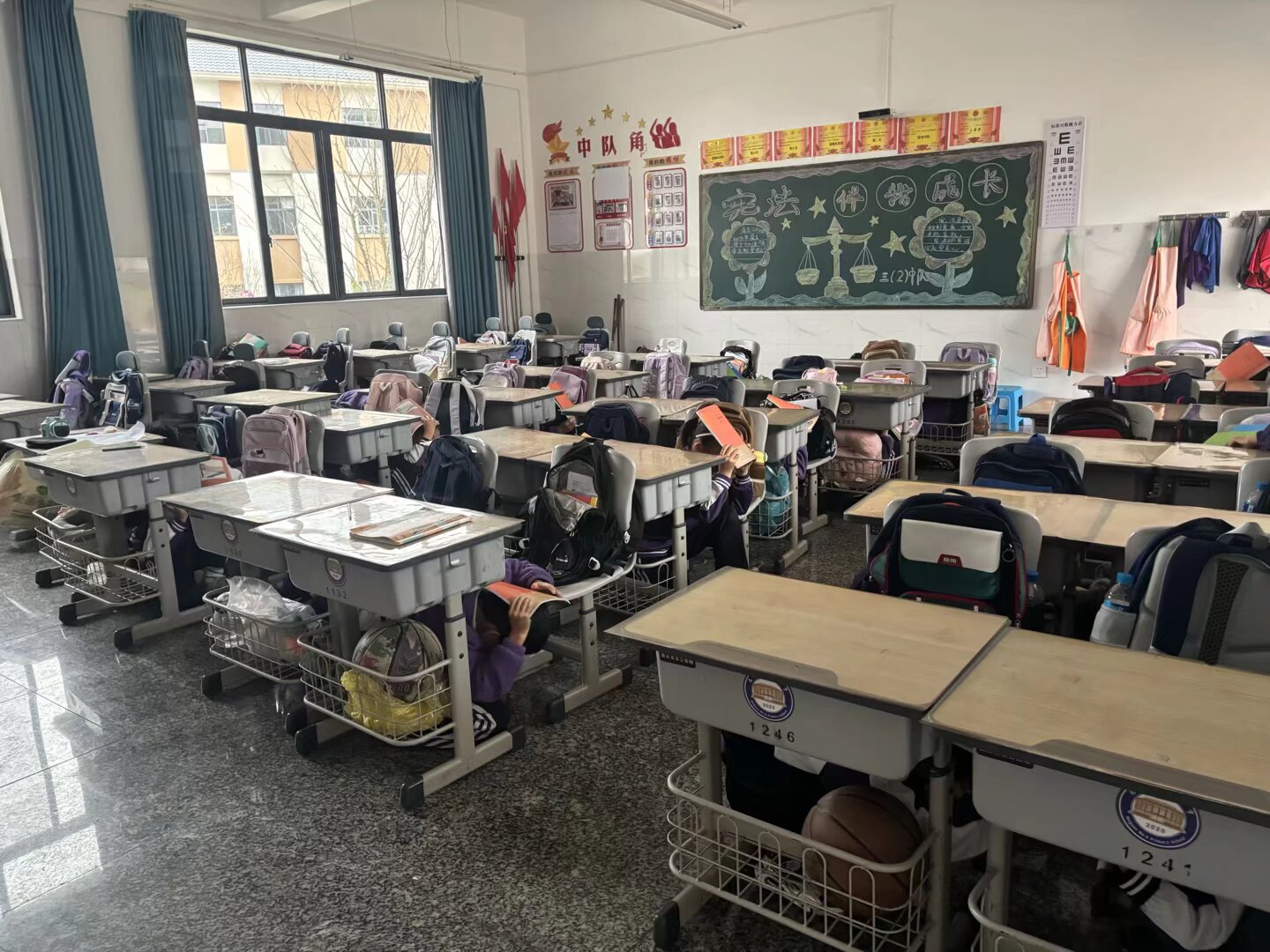 紧接着,地震应急演练同步开展。地震预警信号发出后,学生们迅速双手抱头,就近躲在课桌下方、墙角等安全区域做好紧急避险准备;待疏散指令下达,师生们沉着响应,按照规范动作有序撤离,全程听从指挥、步调一致,地震应急演练全程用时 2 分 20 秒,圆满完成疏散任务。师生抵达集合点后,各班迅速清点人数并逐级上报,确保全员安全、无遗漏。